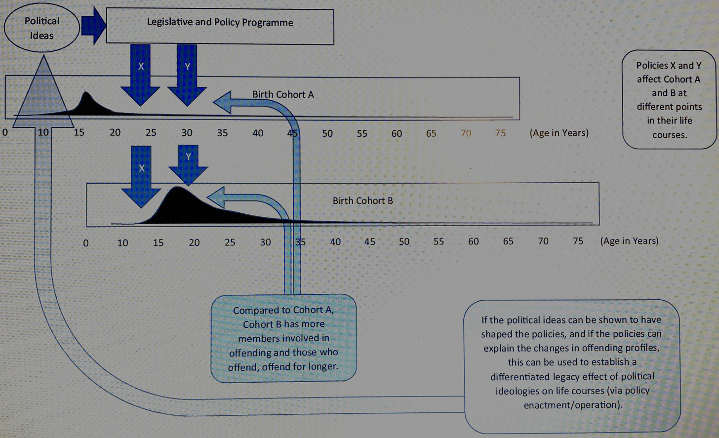 The framework we adopted is shown in Figure One, and specifically relates to our studies of the immediate and long-term impacts of Thatcherism. The figure illustrates how political ideas (developed and expressed when the individuals in Cohort A were very young) may have produced legislation and policies which came into force in their 20s and 30s. As such, these ideas and policies did not affect the numbers of people in that cohort who offended. The same legislation and policies, however, did affect the offending of Cohort B (born 15 years later in our diagram). If, as the box in the rightmost bottom corner states, the ideas can be shown to have shaped the polices, and these can be used to explain the differences in rates and durations of criminal careers between Cohort A and Cohort B, then one might conclude that ideologically-induced policy changes shape different cohorts’ offending trajectories (producing Inter-Cohort Effects). Keeping in mind the fact that in any society there will be variations within any birth cohort due to gender, ethnicity, and socio-economic status, and further that these may also be spatially-clustered, it is easy to imagine how Intra-Cohort Effects may also be present.